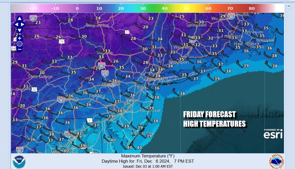 As the warm front passes it could produce a few snow showers mainly north and northeast of NYC overnight into Sunday morning. Temperatures probably won’t be moving much overnight as winds shift to the west and milder air comes in for Sunday. Clouds early Sunday morning will give way to some sunshine. Highs Sunday afternoon will reach the upper 40s and even some lower 50s.
