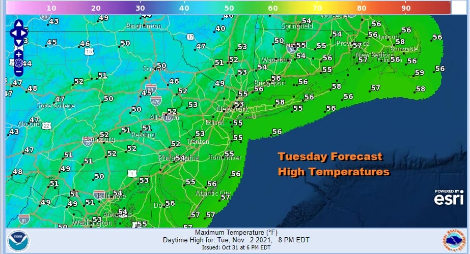 There are no changes in the outlook for Wednesday through Friday. It will be chilly by day cold by night. We could see some inland areas drop down to freezing Wednesday morning and highs Wednesday in spite of sunshine will be in the upper 40s and lower 50s. Then it will turn even colder Wednesday night and we could have a more widespread freeze or frost. This should be away from warmer urban centers and coastal areas.