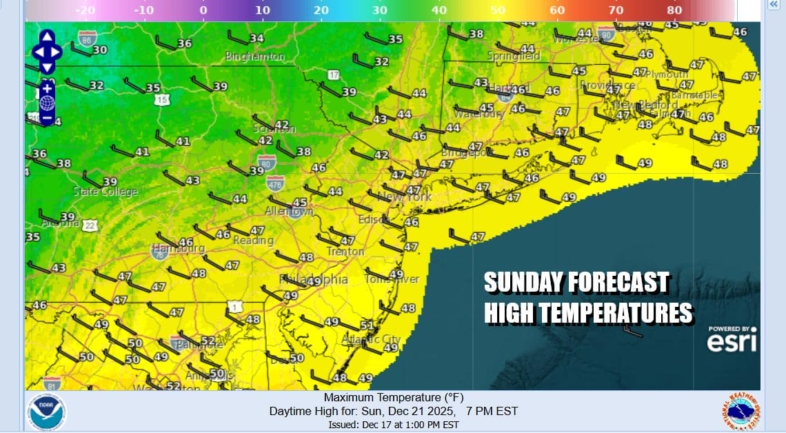 Most lows tonight under clear skies across Eastern Pennsylvania to Southern New England (including Long Island and New York City) will be in the 20s. Monday looks to be a nice day as cold high pressure sits overhead. We should see mostly sunny skies for much of the day and only late in the afternoon is when clouds start to come in from the west. Highs Monday will be in the upper 30s.