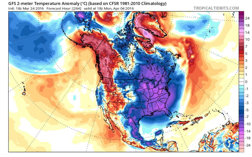 This is the departure from normal on Monday April 4th on the GFS model. It shows temperatures running 15 degrees below normal. This puts highs in the low to mid 40s and lows in the 20s if this is correct. The Euro model might be a little colder than this judging from the upper air structure. I think the bottom line is that if you were thinking about planting early, I would hold off.