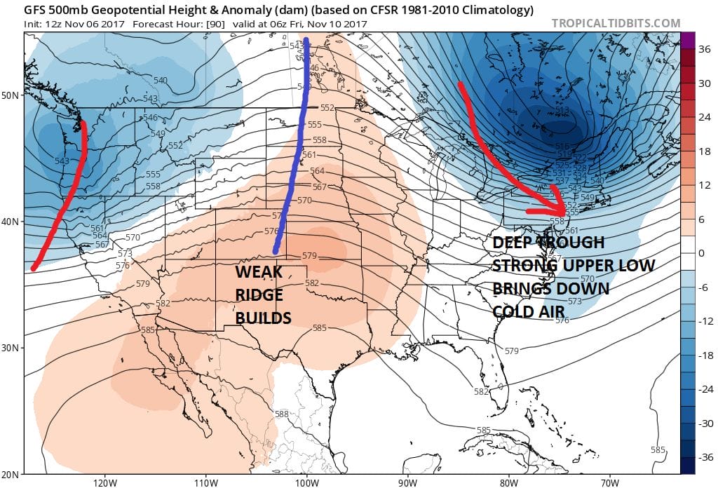 Once the front passes we will begin a gradual cool down through Thursday until the main push of cold air arrives. The jet stream is taking a sharp dip in the east bringing the cold air straight south out of Canada.