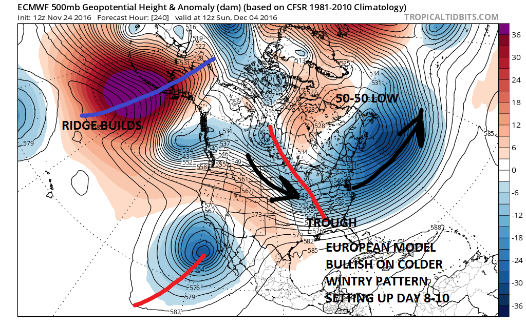 The European model is very bullish on an early wintry pattern day 8-10 with the establishment of a low at 50N 50W or what is known as the 50-50 low. A trough begins to set up to the west. An upper air pattern such as this would establish much below normal temperatures in the east as we move into early December and opens the door for snow opportunities. The large differences in the two models seem to hinge on the idea that the GFS phases the trough in the west while the GFS keeps the southwest upper air storm further south and the trough leaves it there and instead digs into the Midwest. Models have been guilty of phasing too much in the last several weeks. The GFS did trend more toward the European solution in the last 2 runs through day 7 but remains steadfast in its idea beyond day 7. This grueling process continues. We can say that the North Atlantic Oscillation stays strongly negative through the next 2 weeks along with the East Pacific Oscillation. That combination may be enough to signal a colder pattern developing as we move into the first 2 weeks of December.