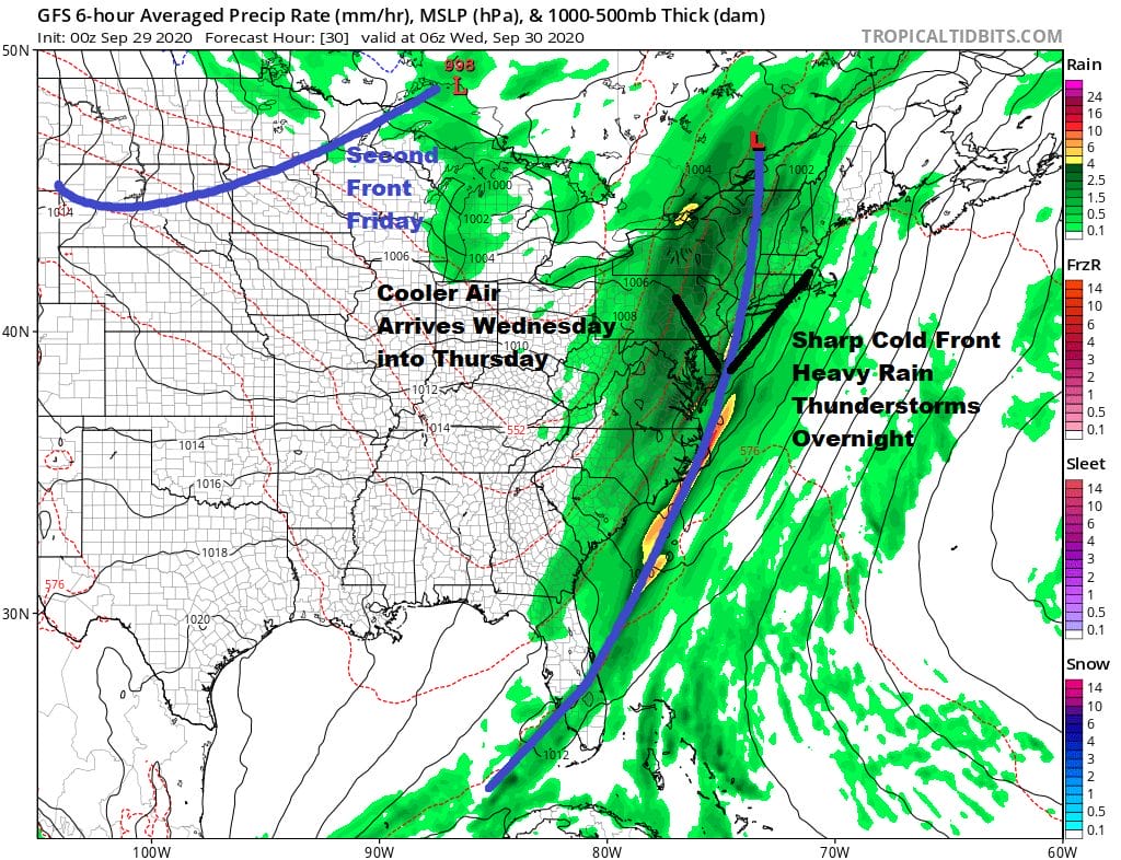 Wednesday’s cold front is only the beginning as we have another cold front behind it with a stronger longer lasting shot of cool air. Thursday should be a decent day of sunshine and highs will be in the upper 60s to some lower 70S. Friday the second front arrives with a developing wave and that probably means some rain or showers with temperatures in the 60s.