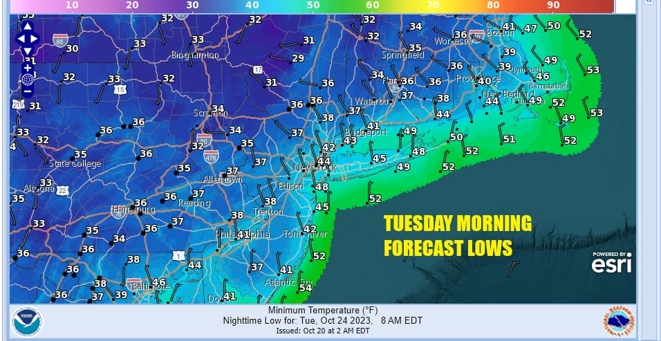 Sunshine this afternoon will take temperatures to the upper 50s and lower 60s. Other than a few passing clouds there will be no rain issues. Then tonight under clear skies and lighter winds, especially inland, lows will be in the 40s but colder spots inland will be in the 30s and some patchy frost is likely in parts of the Hudson Valley, as well as Northeast Pennsylvania and the Catskills and possibly Northwest New Jersey.