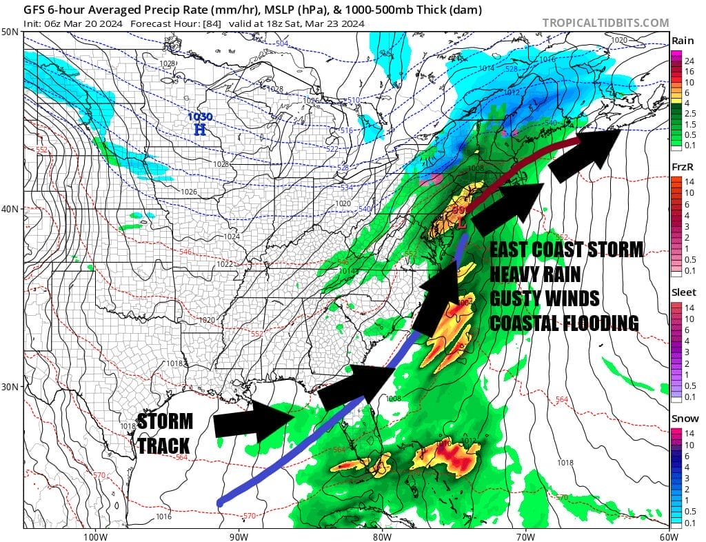 There are a few things going on this weekend that will be important regarding the outcome. First is the fact that we may have coastal flooding issues this weekend. We are headed into a full moon, and we have seasonally high spring tides. The track of the low suggests east to southeast winds Friday night and Saturday which means that coastal New Jersey and Long Island as well as Southern and Southeastern New England will have issues with moderate coastal flooding risk.