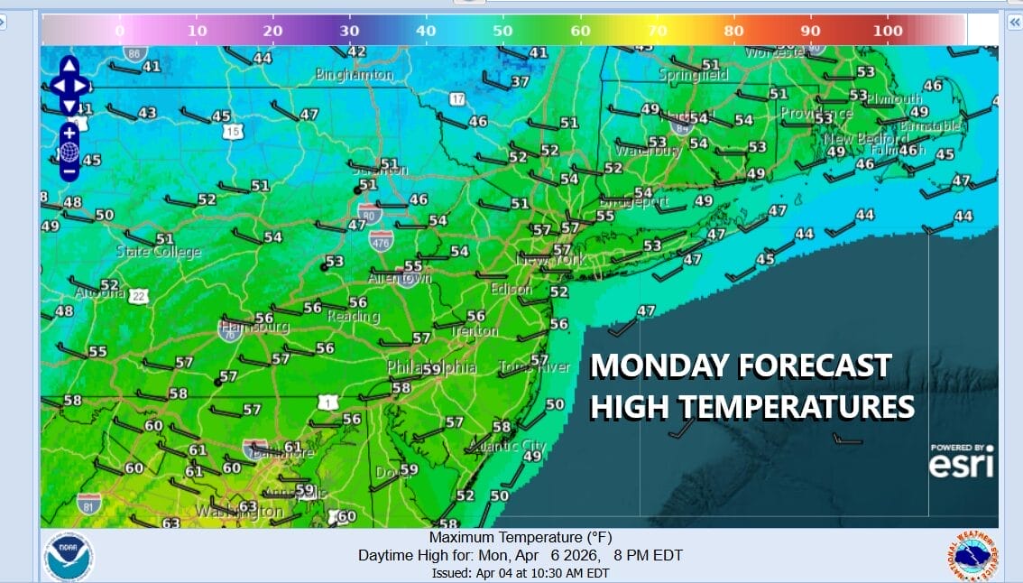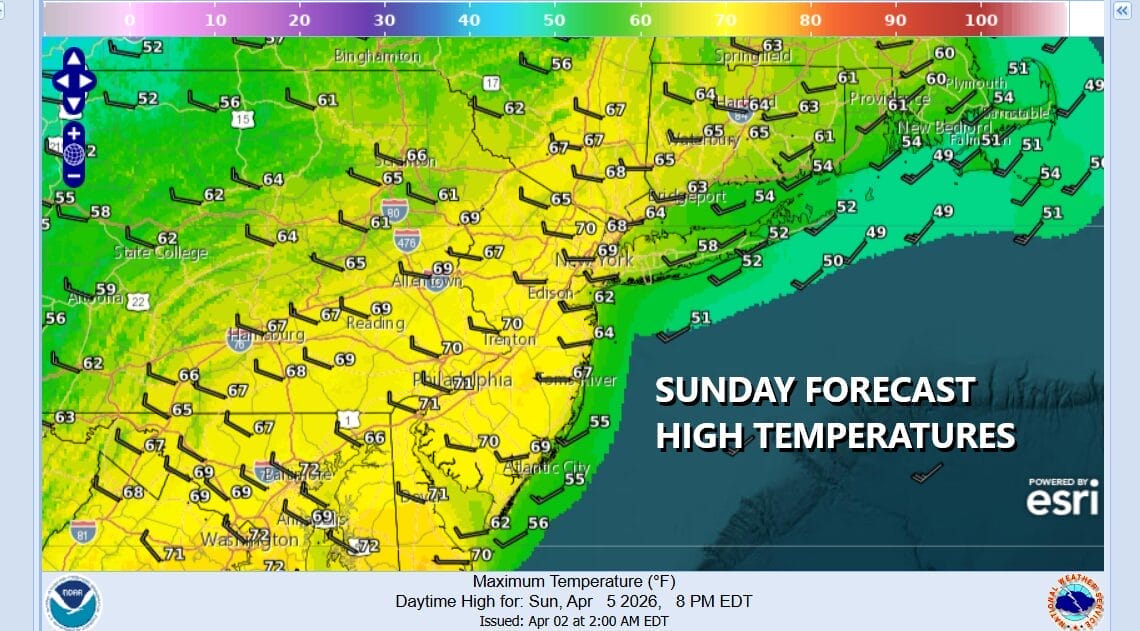Happy Easter to all and on this Easter Sunday we have some changes in the weather to deal with. Warm conditions ahead of a cold front which will pass mid morning to early afternoon followed by colder air through Wednesday of the new week. Temperatures today will top in the upper 60s and lower 70s but that will come early. Showers will develop and pass through mid morning into early afternoon from west to east.