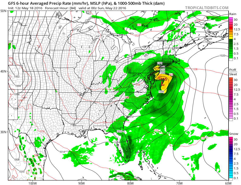 The Euro model has at least taken the wrapped up gale center of yesterday off the table for the time being. Both models would suggest these are minor nuisances. Either way once this exits the area after the middle of next week, the weather pattern shifts somewhat to one where everything moves along and no onshore flow. This would be relatively good news as we approach the Memorial Day holiday weekend.