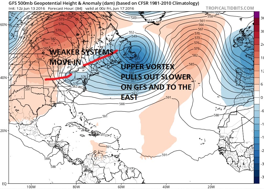 The two models on this afternoon’s model runs are distinctly different. The GFS takes the upper low intact and moves it out east northeast. This leaves the vortex influencing the weather in the Northeast US. The result is that the systems behind it are weaker and with much less room. The European on the other hand takes the vortex straight north and opens up the entire northeast to the troughs dropping southward. This creates the opportunity for another upper air storm to form along the east coast and a coastal surface low that goes with it. Since that vortex gets left behind, it would mean rain for much of the coming Fathers day weekend.