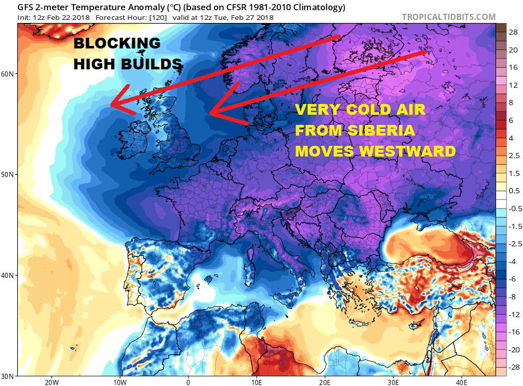 This week of cold air will create temperature anomalies of 20 degrees F below average for at least several days beginning early next week in Europe. Back home meanwhile we will spend next week quietly into Thursday with reasonably mild weather until the block moves westward which all models show happening later next week.