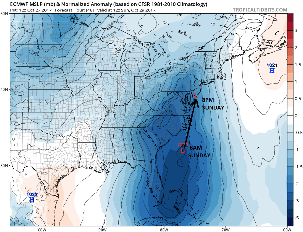The low tracks from southeast of Charleston South Carolina at 8am to near or just west of Cape May New Jersey by Sunday evening 8pm. From there it runs northward to just east of Lake Ontario near my favorite fishing spot Pulaski NY.
