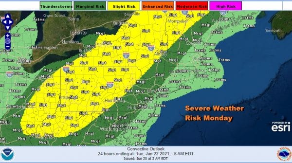 Monday does bring severe weather risk inland and the Storm Prediction Center has a slight risk of severe weather for much of Pennsylvania northeast into Northwestern New England. Marginal risk reaches into New Jersey to about NYC and points south and west. Thunderstorm risk here is more for Monday night and not so much for the daytime Monday.