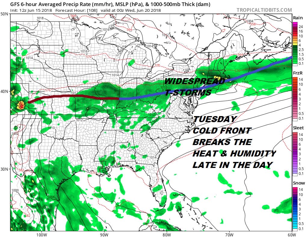 There are no important changes in the forecast for the next three days. We will see lots of sunshine on Saturday and Sunday. Temperatures Saturday will be in the 80s with low humidity. Sunday it will be in the 80s to near 90 with slightly higher humidity. The brutally hot day will be Monday with highs in many areas reaching the mid to upper 90s which will mean record highs for some areas.
