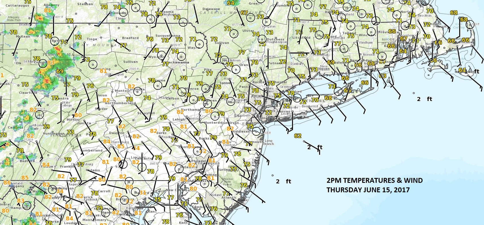 It’s a nice enough afternoon though we have clouds masking the sunshine. Temperatures inland have broken the 80 degree mark in some places away from the ocean but most temperatures are in the 70s. There are some showers on the radar well to the west and north and they should pretty much stay west of us through this evening. However the satellite loop does show clouds to the west in the Ohio Valley with an upper air disturbance and this could produce a few downpours during the early morning hours Friday.