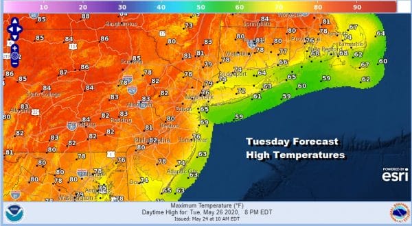 Today should have turned out to be the better day of the entire holiday weekend. Instead it seems yesterday will take the prize for best day for most (but not all) as we woke up this morning to lots of low clouds and even a few showers that came in from off the ocean and moved over parts of Long Island and Southern New England. Temperatures are in the low 60s at midday and it is hard to see how we will get any kind of sunshine this afternoon judging from the satellite picture. Weak low pressure is offshore. Some breaks of sunshine are occurring over Northeastern Pennsylvania but unlike yesterday there are clouds up in New England rather than dry air. While it is not likely to rain this afternoon or evening, the gray gloom seems to want to hang on through this evening at least.