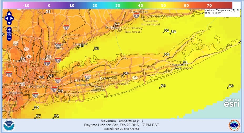 The weekend is underway and we have a beautiful Saturday with plenty of sunshine and temperatures heading up through the 50s to near 60 in some areas. Along the shore some local sea breezes will develop but they should hold off until mid or late afternoon so temperatures at the shore will probably drop back into the 40s. Just letting you know in case you are tempted to take a shore stroll today. The Islip record today is 54 so it wont take much to break that.