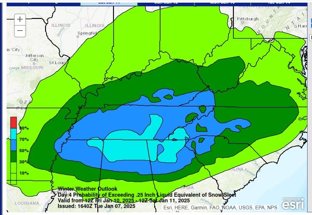 The Weather Prediction Center has highlighted in light blue an area where there is a 70 to 90 percent chance for at least 3 inches of snow and sleet while the darker blue represents 50 to 70 percent. This area extends as far south as Birmingham Alabama and Atlantia Georgia as well as Charlotte North Carolina.