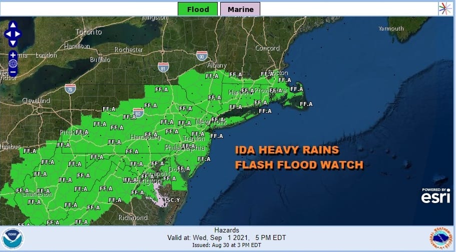 The remnant low and the rains of Ida continue to march to the northeast and we have widespread flash flood watches posted from the Central Appalachians to Southern New England. The rains will arrive Wednesday morning and last into early Thursday morning when the low moves offshore and then heads away to the northeast. Rainfall amounts will be in a range of 2 to 5 inches in most places with some locally higher amounts making flash flooding likely especially in the usual suspect spots.