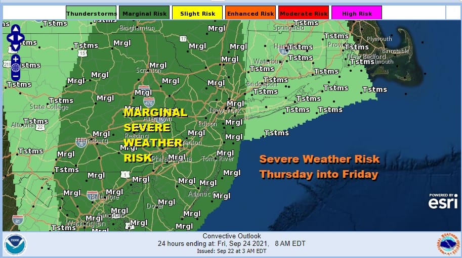Severe weather risk is part of this equation and the Storm Prediction Center has a marginal risk of Severe Weather for Eastern Pennsylvania and New Jersey southward and east to Western Long Island and the Hudson Valley. There is a 2% tornado risk indicated for much of the marginal risk zone. Thursday highs will be in the 70s to near 80 degrees for most areas though temperatures drop once the front passes.