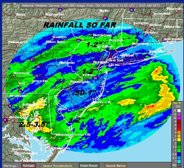 So far the rainfall amounts have been anywhere from a 1/2 inch to 2 inches since Wednesday across the area but note the uneven distribution of the rain. The heaviest of the rain has been in Southeastern Pennsylvania Southward and also in a band from Northeast Pennsylvania, across the Hudson Valley and extending into Connecticut.