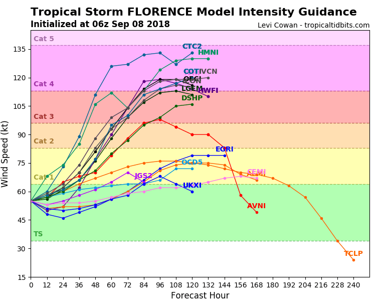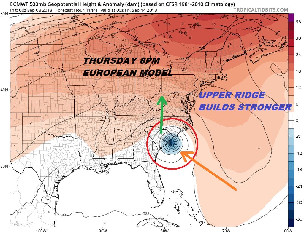 The European model splits the difference between the Canadian which takes it to the Georgia coast and the GFS which takes to coastal North Carolina. I think that is a fair assessment of the area of greatest risk. A strong ridge would take it further southwest but we need to be cautious here. If Florence strengthens to a category 4 hurricane it could favor a more northerly course which would then lean more toward the GFS model which actually sees this as a category 4 hurricane while the European pressure on Florence suggests a category 2. The intensity models are very impressive with a number of them going to category 4 and some of them get there quickly.