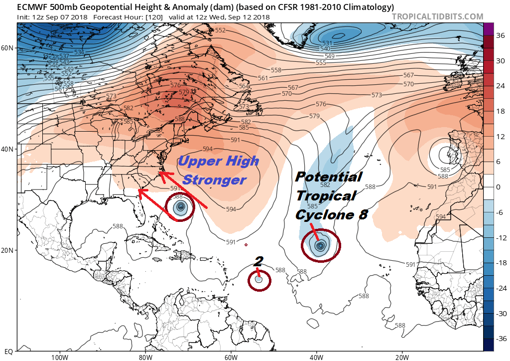 Weather models all show a strong ridge building off the East Coast and the European is especially strong with this feature. There is nothing upstream in the Plains or in Canada to weaken the ridge to cause a recurve. Florence would move around the periphery of that ridge which is forecast to hold for all of next week. It would seem that if this is correct the threat of a direct pass for our area lessens while the threat for a direct pass for the Southeast US coast increases. We will wait a few more runs to see if this trend continues. The ridges on the models have been coming in stronger for much of the last month. There is very little reason to think it would be different this time around.