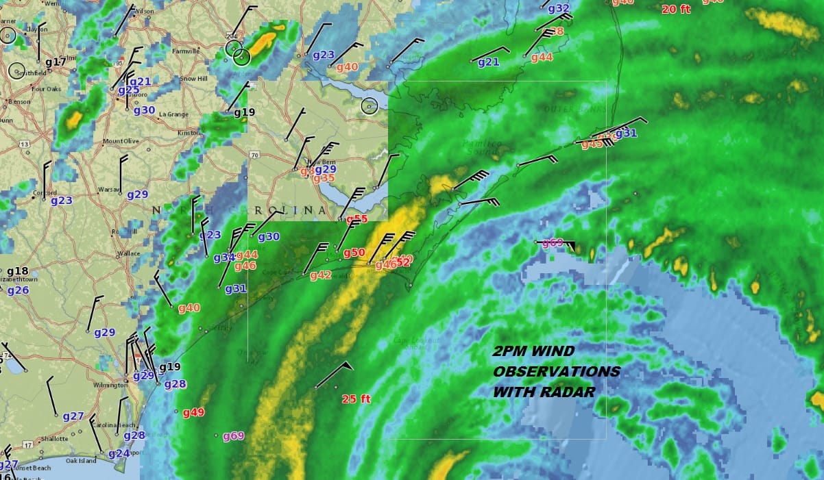 The weather observations at 2pm show 50 mph wind gusts on the coast with gusty winds and heavy rains spreading inland. The satellite loop below shows Florence near the bottom. We are sitting in clouds but they are not coming from the hurricane but from the decaying weather front overhead.