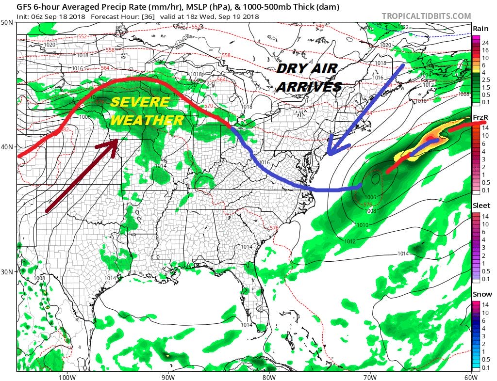 The remnant low of Florence is now moving along through upstate NY and into New England. The circulation is very hard to see at this point so we really don’t have much left from the tropical system at this point other than some waves of rain. A cold front will be approaching the coast and we are fairly deep into this tropical air mass so there will be bands of downpours and thunderstorms moving through today. Some of the rain could be heavy and some of the storms could be strong. The main area of rain probably comes this afternoon and evening. Temperatures will be in the 70s to near 80 today. Though the Storm Prediction Center is not indicating a risk for severe weather this morning but I would not be surprised to see a few severe thunderstorms popping up in the mix.