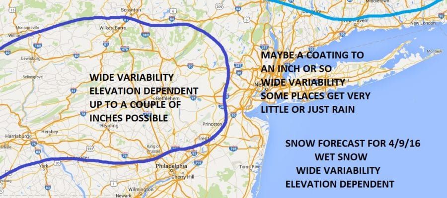Here is my snowfall forecast map for Saturday. Wet snow and rain begins during the morning hours in western areas of New Jersey and Eastern Pennsylvania and moves to eastern areas of Long Island and New Jersey during the afternoon and evening. There will be wide variability from place to place. Some places will see wet snow coming down and others nearby could see rain. Some areas will elevation could see a couple of inches on the grass while in a nearby valley there will be a coating. These upper air systems in the spring are so difficult to figure. My main take away from this is that since there is no real development of any kind of coastal low, the area of precipitation should not be anything excessive. And since the bulk falls during the day, it keeps roads wet.