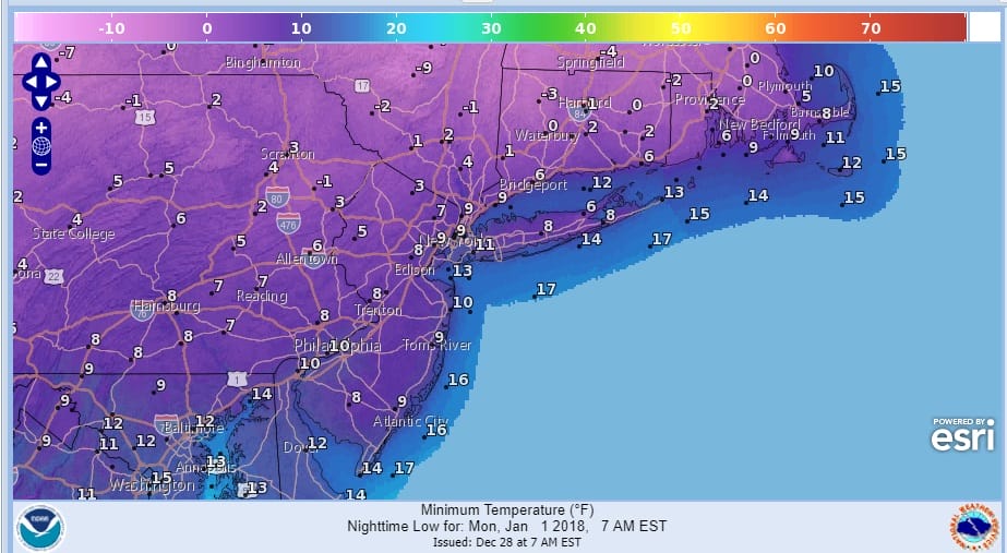 New Years Eve will be brutal with strong gusty winds and temperatures in the teens. When the ball drops at midnight temperatures will be somewhere between 5 and 15 and by morning it could drop to below zero in areas just inland of the coast with single digits elsewhere and Monday’s highs will be just in the teens. We will do it all over again on Tuesday but with less wind.