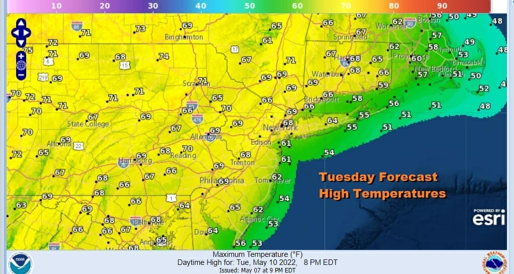 As the week progress the high to the northeast gradually builds back westward. The upper low and remnant storm to the south are still creating an ocean flow but it is weakening. That should allow temperatures to climb higher a little each day. We should reach into the lower 70s Wednesday in most places with partly to mostly sunny skies.