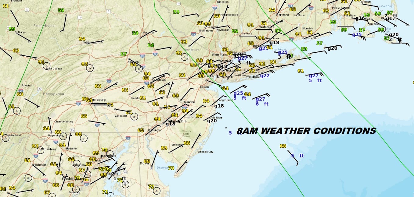 This is going to be the big issue today in that there are going to be showers dotting the radar throughout the day and some areas might seem them and some might not. The risk will be there but for most of the time for most of the area it won’t be raining. Also temperatures will be an issue today and from 195 in New Jersey north and east to NYC, the Hudson Valley Southern New England and Long Island it will be upper 60s to lower 70s all day with an east wind. South of Route 195 across Southern New Jersey and Southeastern Pennsylvania it should reach into the 80s. This is where the severe weather threat exists for late today.