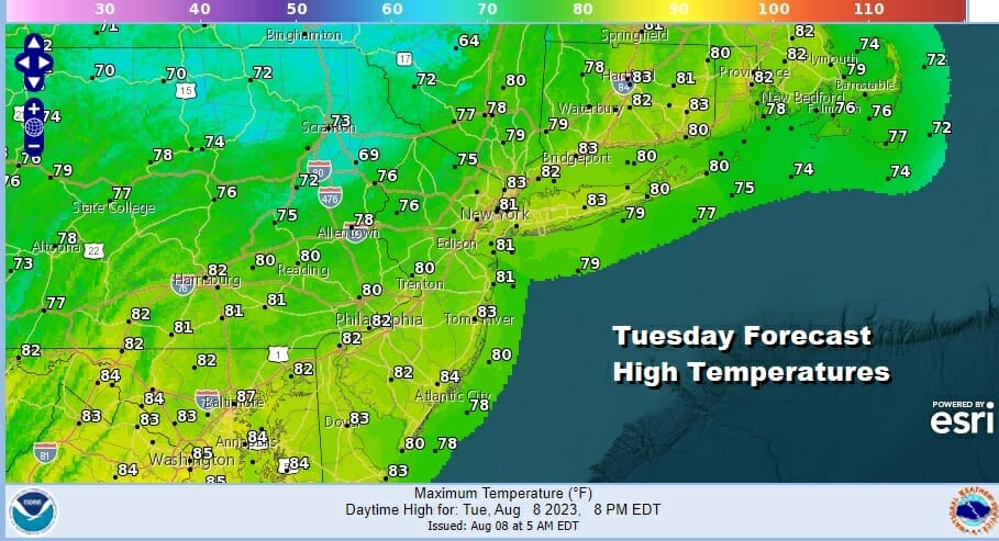 Since we are still dealing with the upper trough a shower or thunderstorm popping up can’t be ruled out see will give it a mention today for Eastern Pennsylvania to Southern New England with a higher chance in Southern and Southeastern New England. Otherwise it is a mix of sun and clouds today with highs reaching into the 80s. Dew points will be lower than yesterday, so yes it will be less humid. Then again anything compared to yesterday is probably less humid. The exception to that will be the areas to the east where the dew points will still remain rather high today.