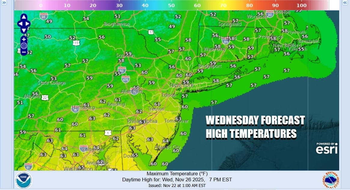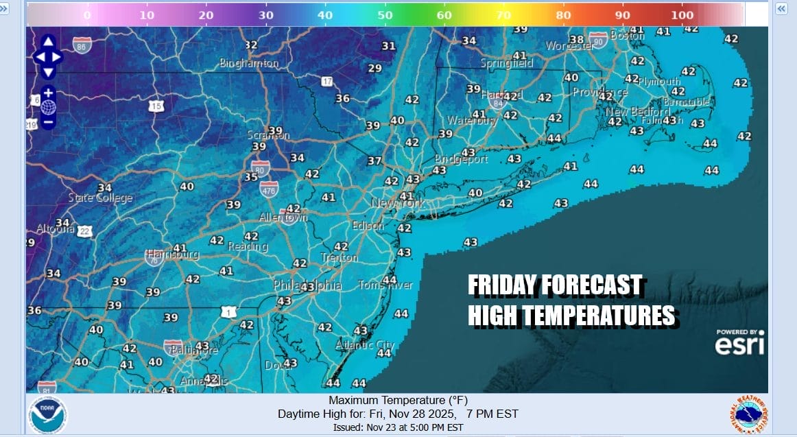 Getaway day for the Thanksgiving holiday is not going to be too problematic. We had rain overnight but that is gone now. Two cold fronts have to pass. the first will have the risk for a couple of showers later this afternoon. The second and more consequential front passes through tonight and once that goes by much colder air will begin to arrive. However for today we will see clouds, and perhaps a few breaks of sun with the risk of one or two showers late in the day. Highs will be in the upper 50s and lower 60s.