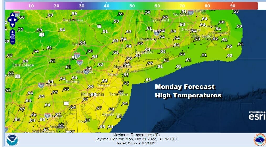 The last day of the month of October, known as Halloween, is not much of a scary day. We have clouds that are starting to roll in from the west but it doesn’t look to be a solid overcast at least initially. There are some showers on the radar loops out to the west moving into Western and Central Pennsylvania. Those showers are moving northeast and should be an issue during the day for Eastern Pennsylvania to Southern New England. Therefore we look for changeable sky conditions today with most highs in the 60s.