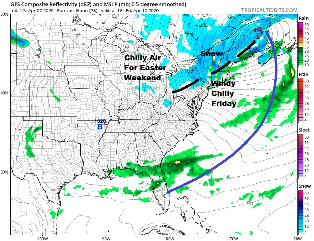 Sky wise Friday looks to be in and out sun and clouds. I’m going to leave the risk of passing rain shower in the forecast and well inland a snow shower can’t be ruled out. Then it is on to Easter Weekend which looks to be dry for both Saturday and Sunday. Sunshine and chilly conditions are forecast for Saturday with highs mostly in the 50s. Sunday look for arriving and thickening clouds. Low pressure will be moving up the East Coast with rain for Sunday night and Monday. With some luck the rain should hold off until late Sunday or Sunday night keeping much of Easter Sunday dry.