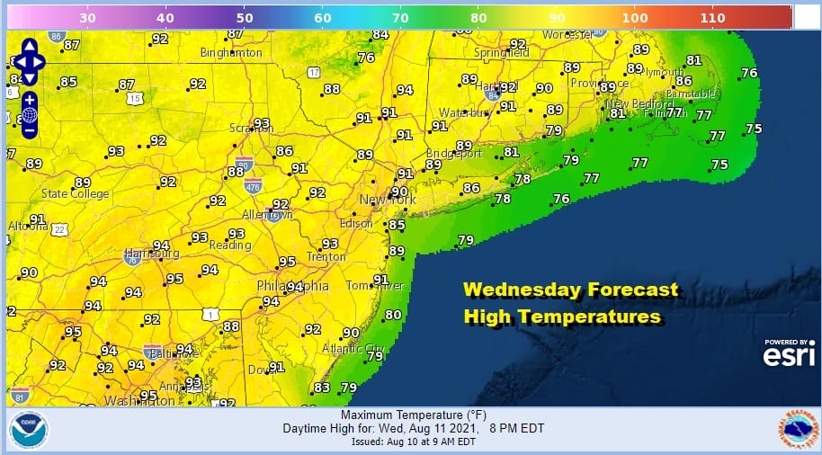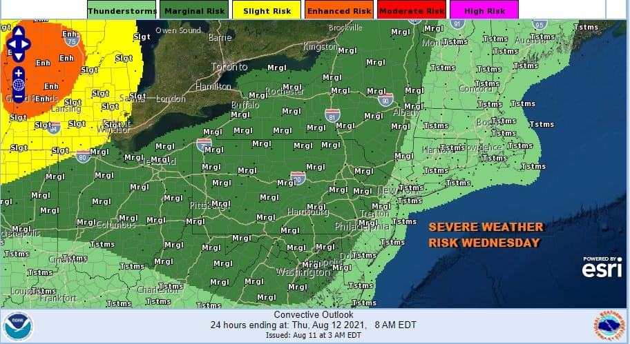 All this does is add to the humidity and when the sun goes to work today it will take temperatures up to the low and middle 90s. It also sets us up for some severe weather risk inland and the Storm Predicition Center has a marginal risk for severe weather for inland New Jersey and points west and north. We saw some strong to severe thunderstorms develop yesterday evening in some places and I suspect we could see them again late today.