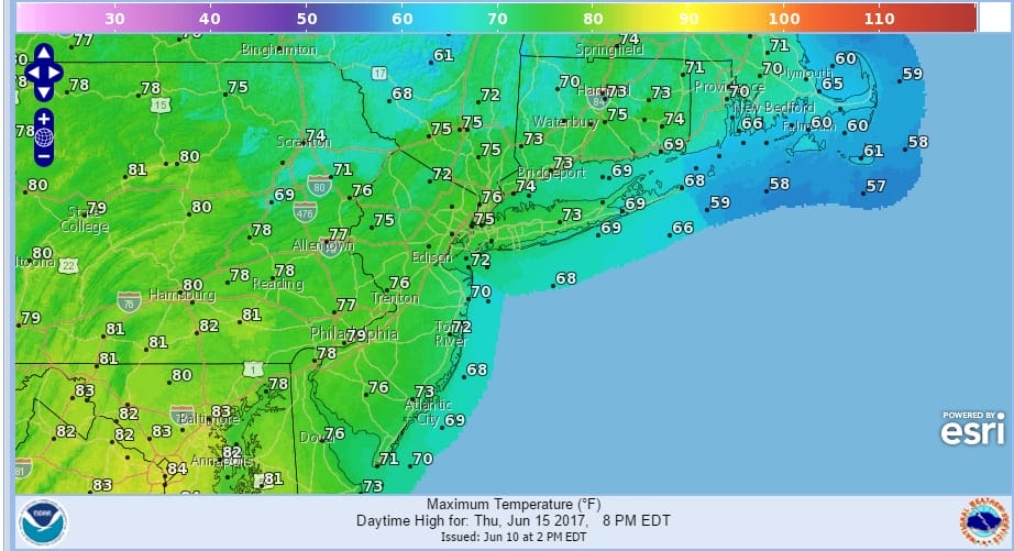 The first day of this “heatwave” saw temperatures hit the upper 80s to lower 90s this afternoon from South Central and Eastern Pennsylvania to New Jersey, Southeastern NY, Connecticut, and Long Island. The Long Island and Connecticut South Shore was the place to be with a nice sea breeze that came in early enough to keep temperatures in the 70s. That cooler air is working northward along shore locations. In New Jersey the west wind meant a hot beach with temperatures reaching 90 and a sea breeze only right along the immediate beaches late in the day. Skies are clear on the satellite and other than some clouds in the Northern Great Lakes moving northeast, the satellite loop is clean of cloud cover and skies should be nice and clear tonight with most lows in the 60s to near 70.