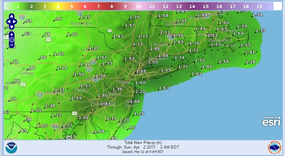 Today and tonight the big story is the heavy rain that is coming. Flood Watches are posted for parts of Western New Jersey while we still have Winter Weather Advisories up for Northeast Pennsylvania, the Catskills and for Eastern Areas of the Hudson Valley and Connecticut north of route 84. Right now I’m thinking the advisories are precautionary and probably a bit overstated. Satellite and radar loops show heavy rains to the south advancing and lifting northeastward. The heaviest rain are this afternoon and tonight. Rainfall forecast amounts are above and it looks like a solid inch and a half to two inches of rain total.