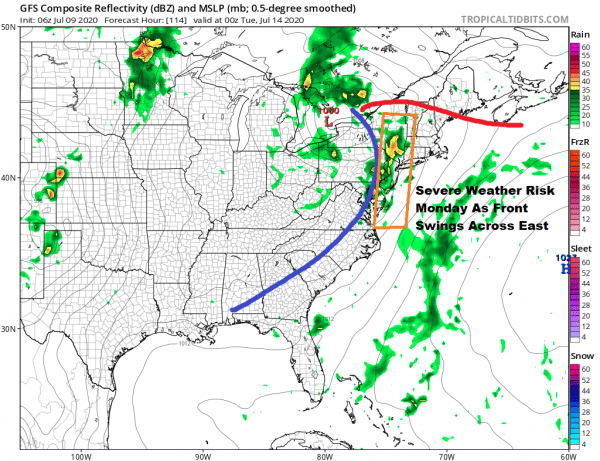 The upper trough that is driving the Friday system northward will be lingering to our west over the weekend and on Monday it will swing eastward and strengthen some. It looks like a a stronger cold front will approach and we do seem to have a set up for severe weather risks in the Northeast south to the Northern Mid Atlantic states. We will be reviewing these prospects once we get through tomorrows rain and coastal winds.
