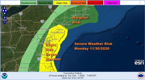 The Storm Prediction Center has pushed the slight risk area for severe weather further north into New Jersey, almost reaching NYC. Marginal risk continues further north into New England. Low pressure in Central North Carolina moves rapidly northward into North Central Pennsylvania. Tropical air surges up the coast and we have a cold front swinging east. All of this adds up to thunderstorms with the highest risk late morning into this afternoon.