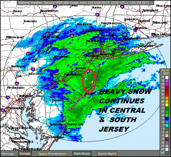 Latest radars show that the heaviest snow bands continue to come from off the ocean and Central & South Jersey coastal counties from Monmouth Southward are seeing moderate to heavy snow and we even saw some thundersnow pop up earlier this evening. Snow rates are 1 to 2 inches an hour there and this should continue for the next several hours.