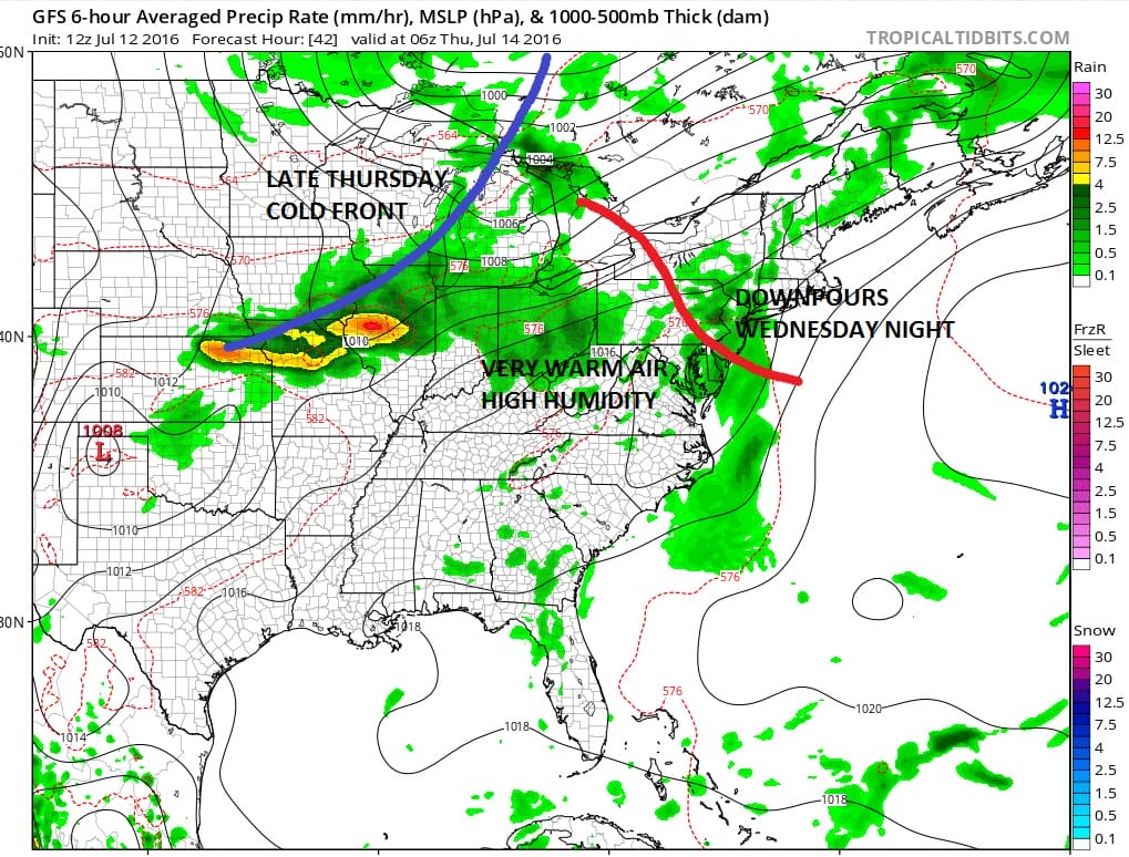 Wednesday we will begin to see humidity increase during the day along with arriving clouds but I don’ t think there will be any showers or downpours during the day except perhaps in Western New Jersey and Eastern Pennsylvania. Some downpours and thunderstorms could develop there in the late afternoon and evening. There is a bit of a warm front that will be coming through Wednesday night to complete the transition to a very warm and humid air mass. There should be some downpours in some places Wednesday night as the front moves by. Then Thursday we will see a very warm and humid day with highs well up into the 80s to around 90. The next cold front approaches which might trigger off some late day or evening thunderstorms. No severe weather is expected at the moment as the dynamics here aren’t especially impressive for a severe weather outbreak but we will monitor this.