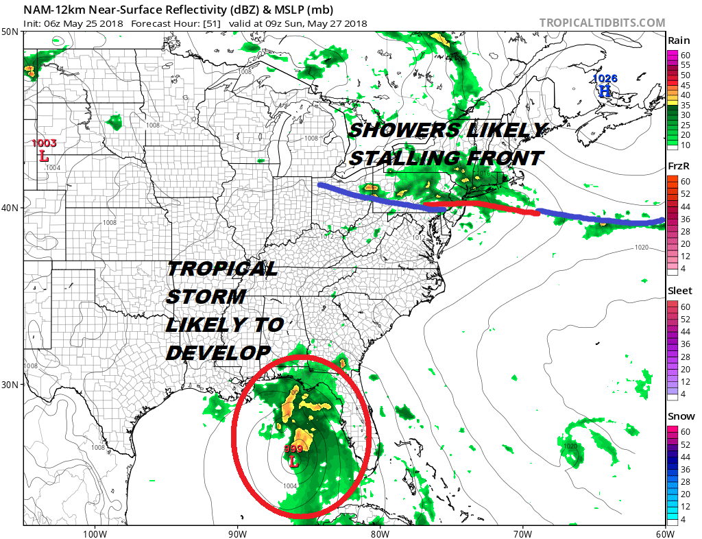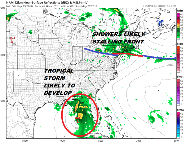 It appears that one round of showers which will be a bit more widespread will occur later Saturday night into Sunday morning as the NAM indicates above. After that they should be of the passing variety and I do not believe that Sunday and Monday are washouts by any means. Meanwhile to the south we will likely have a tropical storm in the Gulf of Mexico the way things are going which would be very rare for this time of year. Regardless of how much this system develops heavy rain will be a big issue with at least 2 to 3 inches in some places between now and Sunday evening with much more to come as this system moves slowly northward.