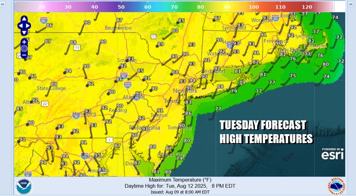 Today will mark day 3 of 90 degree plus highs for much (but not all) of Eastern Pennsylvania to Southern New England. We continue to be in a place where weather systems aren’t moving very much and we are cut off from the flow from Canada to advance a cooler air mass. Humidity levels will be increasing today and highs will reach into the 90s in most places. It will be a day of sunshine and a near zero chance for a shower or thunderstorm. South winds mean that south and east facing shorelines will likely see highs 5 to 10 degrees lower than areas just inland.
