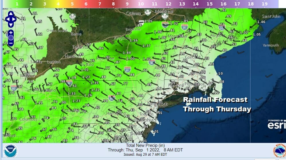 Thursday and Friday will be sunny both days with highs mostly between 80 and 85 degrees. Temperatuers will be a little cooler along the shore each afternoon and no rain is forecast Wednesday through Friday. Right now the Labor Day Holiday weekend looks to be very warm and more humid over time but nothing more than an isolated shower or thunderstorm Saturday through Monday.