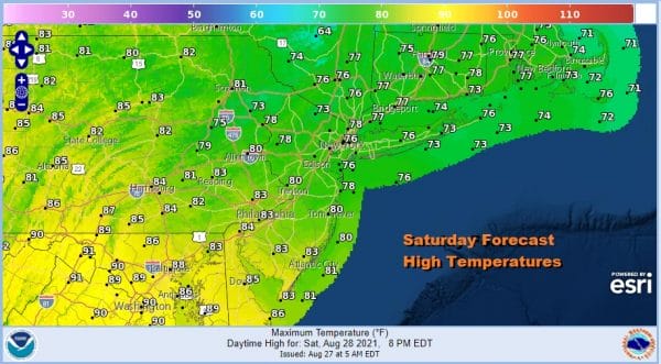 During tonight and into Saturday as the back door front sinks southward, there will be some scattered thunderstorms around the area into the morning hours and as the front shifts southward, weather conditions should improve to the north of the front and stay very warm to hot and humid to the south. Forecast highs for Saturday and Sunday are a bit lower than what we saw yesterday.