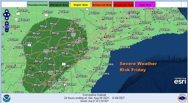 Given the daytime heating, high humidity, a growing unstable atmosphere, and the approaching cold front, the Storm Prediction Center is going for a marginal risk for severe weather away from coastal areas. Thet eastern flank likes along the New Jersey Pennsylvania state line and to the west into Central Pennslvania and south into Maryland.