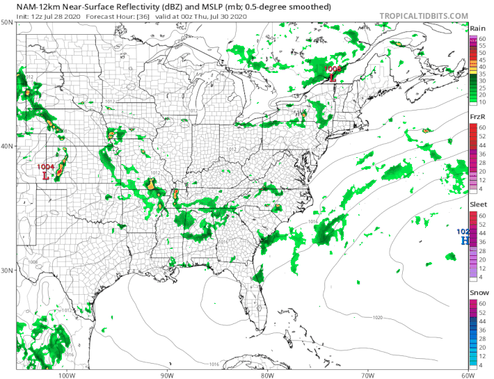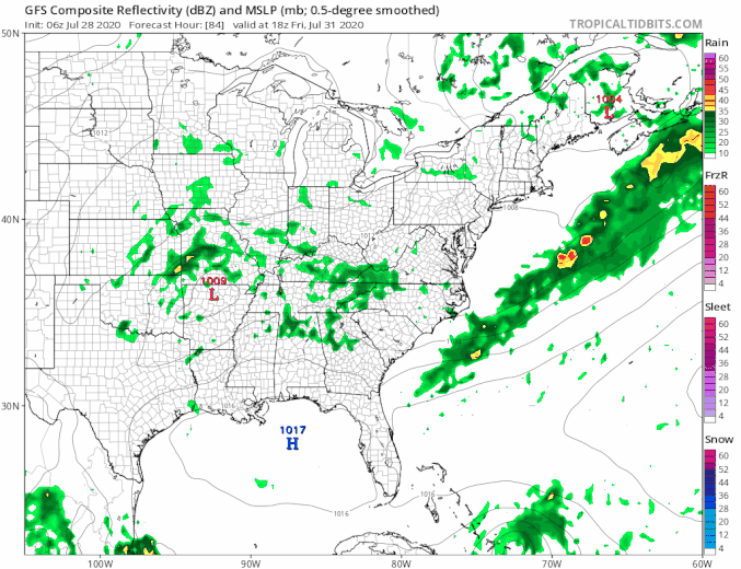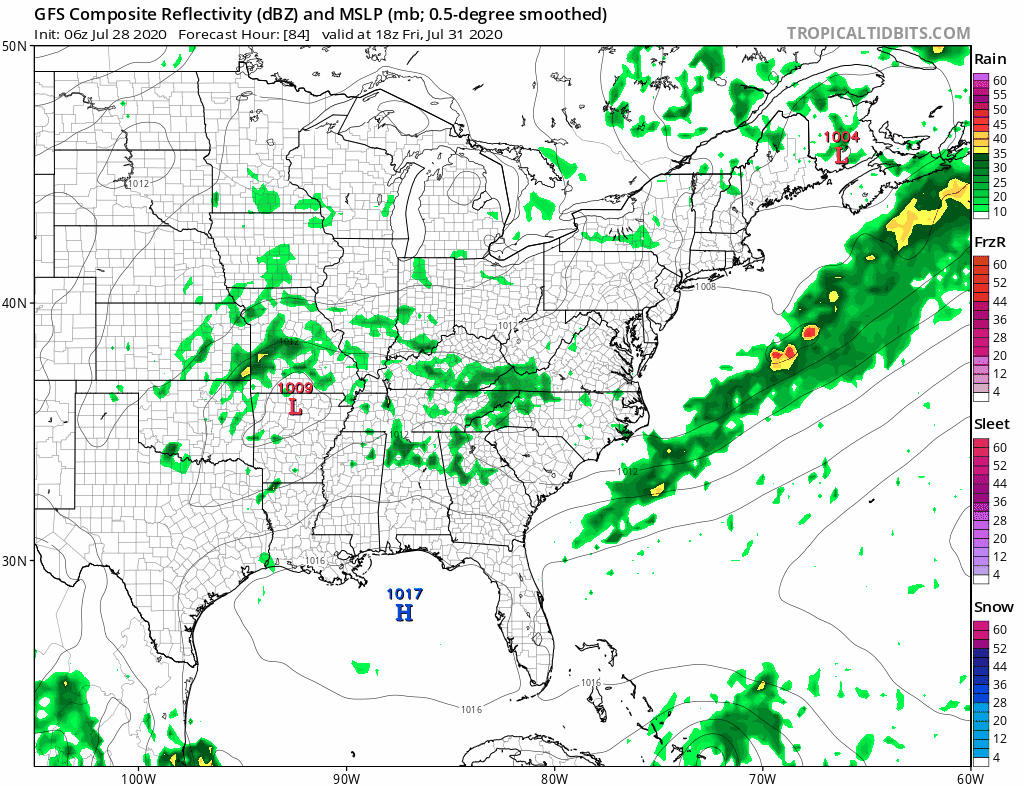 This front pushes south to the Carolinas and that allows high pressure to build in from the Great Lakes for Friday and Saturday. We should see significantly lower dew points and some sunshine. Highs will be in the 80s both days. South of that frontal boundary on the lower right of the GFS loop there is a tropical system, possibly a tropical storm moving northwestward into the Bahamas. The system weakens as it approaches Florida because it seems to be interacting with the frontal boundary to the north. While that seems possible, it is also not a certainty that any tropical system will weaken as it moves northwestward. Storms rarely weaken in this area but it does make for a rather complicated forecast for later in the weekend and for next week. The National Hurricane Center has indicated that a system east of the Leeward Islands could become a tropical storm later today or tonight and we will address that in separate post.