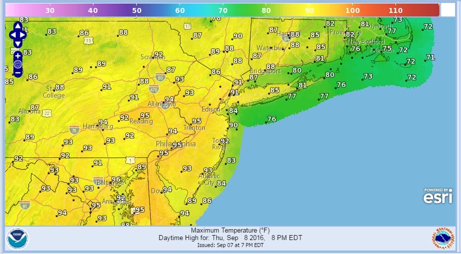 Now that what’s her name (Hermine) is getting out of the way it is time for summer weather to return to the northeast. Today in areas that had full sun like in New Jersey for example it made middle 80s. 90s Thursday & Friday are going to happen and somebody could get to 94 or 95 especially on Friday.