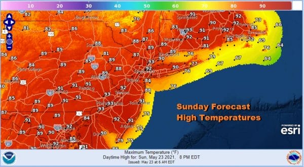 No doubt about it folks, today will be a hot day and it will be hot everywhere including shore locations as the sea breeze will be fighting against a northwest wind and an approaching cold front from the north. It is rather easy forecast today with lots of sunshine into this afternoon. Highs will reach the upper 80s and lower 90s. Someone might push up against 93 or 94 for a high today.